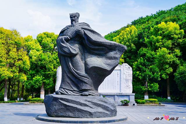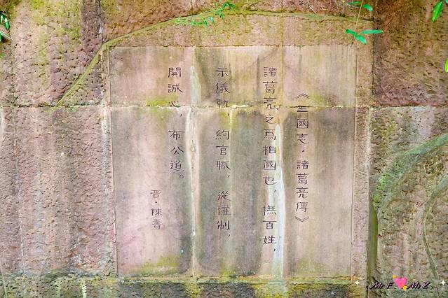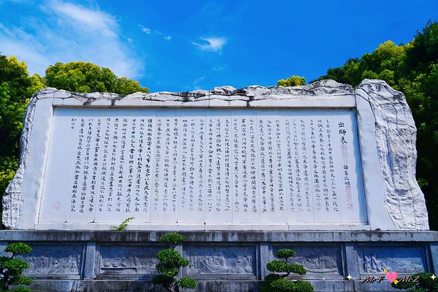 为实现统一,诸葛亮在平息内乱后,于公元227年决定北上伐魏,临行之前上书后主刘禅,言辞恳切,阐述了北伐的必要性以及对后主刘禅治国寄予的厚望,其呕心沥血、忠肝义胆在《出师表》的字里行间得以倾情表露。广场的铜像后面是用汉白玉雕刻制作的《出师表》碑,碑长16米,高4米,字体是江南四大才子之一的祝枝山的作品,正面为《前出师表》,背面为《后出师表》。
