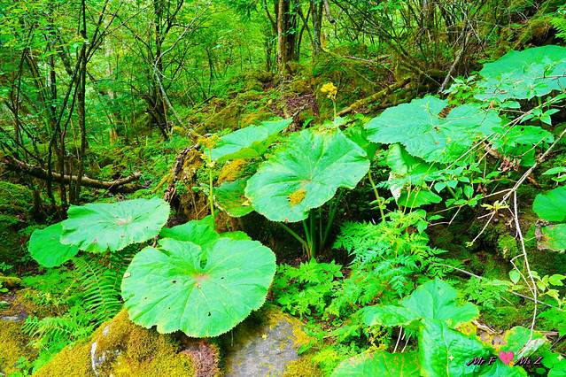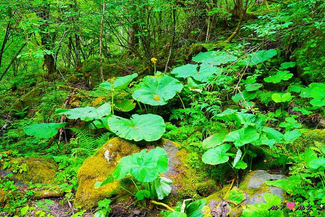 林下还生长着荷叶般的植物,查了资料才知道它叫大黄橐吾,分布在四川西南部至北部、湖北西部的高山上,叶片呈肾形或心形,7-9月正好是它的花期,黄色的管状小花亭亭玉立。