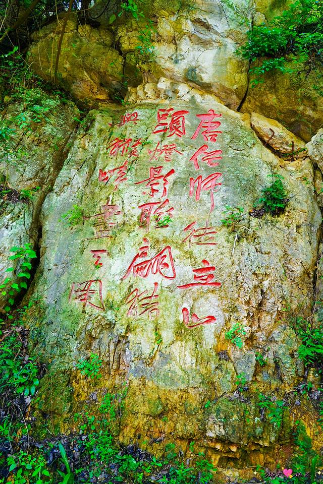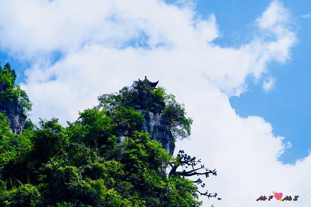 告别灯影石,行至明月台,只见孤峰耸峙,峰顶的邀月亭卓尔不群,遥想诗仙李白“举杯邀明月,对影成三人”的纵逸,顿时就有昔人何在,今我复来的壮思之感。