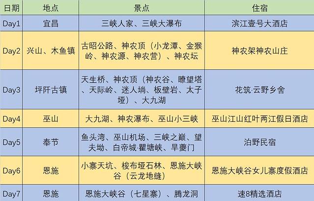 查询了文旅部网站,截至2022年年底,湖北的5A级景区一共有14个,整个神农架林区便是其中之一。另外,宜昌有4个,分别是三峡大坝-屈原故里、三峡人家、长阳清江画廊以及三峡大瀑布,我们根据日程安排选择了其中的2个——三峡人家和三峡大瀑布。恩施有3个,分别是恩施大峡谷、腾龙洞以及神农溪纤夫文化走廊,我们的行程中涵盖了恩施大峡谷和腾龙洞,神农溪纤夫文化走廊虽然在神农架前往巫山的路上会顺带经过,但不在我们此行的打卡范围之内。除了上述5个,再加上巫山的小三峡-小小三峡和奉节的白帝城·瞿塘峡,一共是7个5A级景区。所以我的行程安排如下: