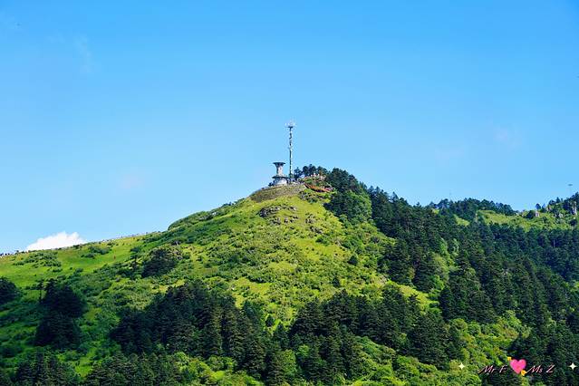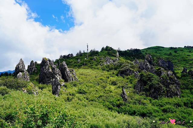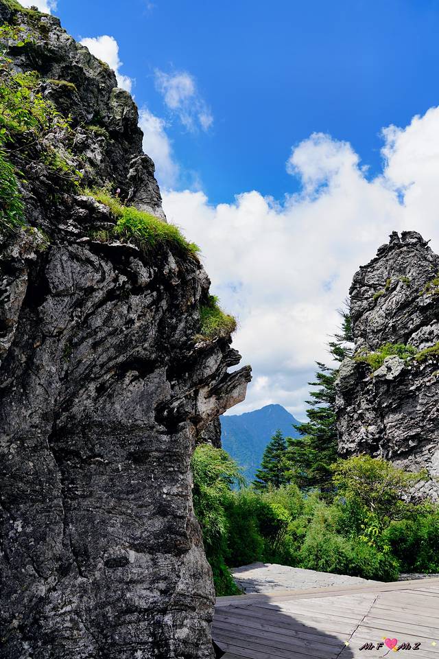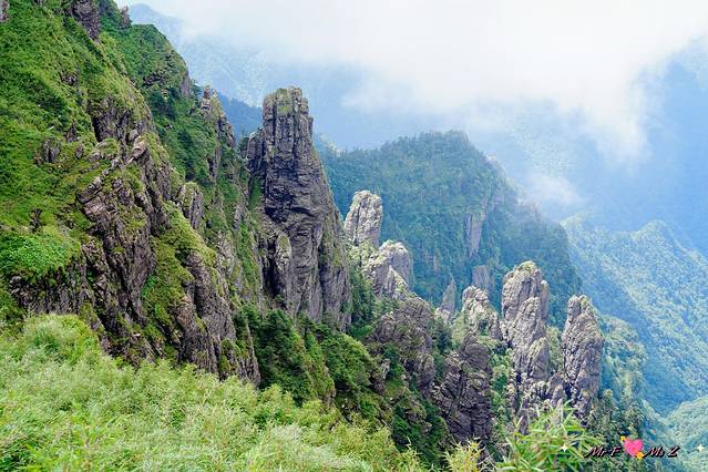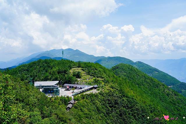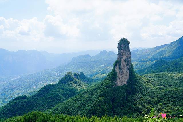 索道上站广场面积很大,可在此小憩后开始后面的艰苦旅程。而且广场视野开阔,观看南边群山时颇有一番“一览众山小”的豪情壮志。左前方那座造型特别的山峰名叫“天楼笋”,它位于小楼门附近,是喀斯特孤峰地貌。