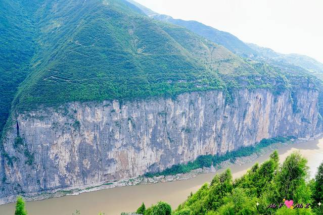旱夔门观景台就位于242国道的边上,一共三层,最下面一层景观最佳。从奉节过来的路上还是大雨倾盆,此刻已是风止雨霁,虽然山间依然有白色的水汽环绕,但经过雨水的冲刷,周围的一切更显得青翠欲滴。
