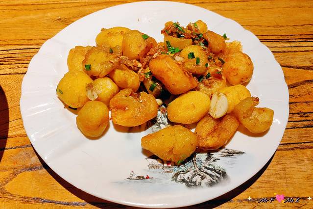 这里顺带推荐一道美食——土家炕洋芋,它是宜昌、恩施一带的特色美食,将洋芋通过少量食用油煎炒焖炸而成。外皮脆韧,内里绵软香甜,吃在嘴里一点儿也不油反而有种烤熟的香甜感。