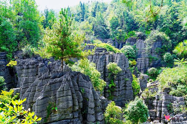 乘索道上山,即将到达时能看见一片险峻的峰丛,这就是小楼门群峰,它们是由三叠纪(2.03-2.5亿年前)灰岩经风化剥蚀、溶蚀、崩塌而形成,其间一并发育了石芽群、峰丛洼地、深沟幽谷等。小楼门是七星寨的南大门,此处植被繁茂,绿树掩映,疏村稀户,鸡犬相闻,仿若一个世外桃源,令人流连忘返。