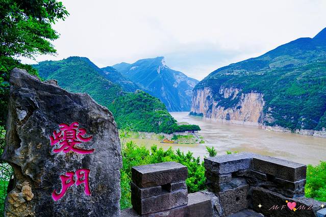 在进入白帝庙之前,我们先打卡了整个白帝城的精华所在——夔门观景台,这里是观赏夔门的最佳位置。赤甲、白盐两山隔江对峙,把整个江面锁的很窄,像一扇门,因奉节古称夔州,所以将这道锁江大门称为夔门。观景台左侧立有石碑,上刻“夔门”二字,夔门不仅是三峡的标志,也是重庆的重要地理标志之一。