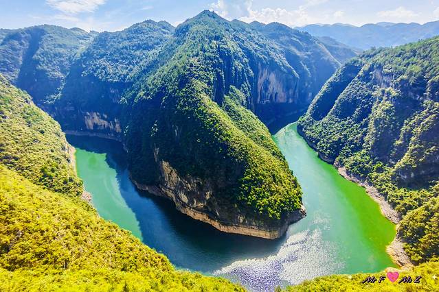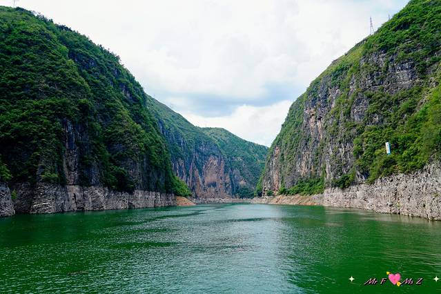 再看鱼头的两侧,壁立千仞,山脊上青藤花草繁茂,峡谷中百鸟飞翔争鸣。江水碧绿,犹如翡翠,微风拂过,荡起阵阵碧波。