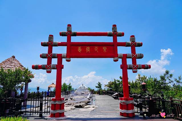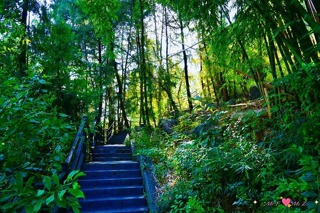 竹律雅欄全长120米,高80-120厘米,大量高低不一的竹子仿照乐谱曲线安插在地面,形成了一道音乐栅栏。栅栏尽头有一汪清池,美其名曰“三峡天池”。驻足良久,我们自行脑补了九歌神坛的演出场景:氤氲水汽里,白衣仙女款款走来,缓缓跪坐于木几之前,左右双手分持两锤依次敲击着黝黑圆润的空灵鼓,时而舒缓,时而紧凑,背后植株苍翠,蓬莱仙境不能与之相媲美,凌霄宝殿亦不敢与之争锋。