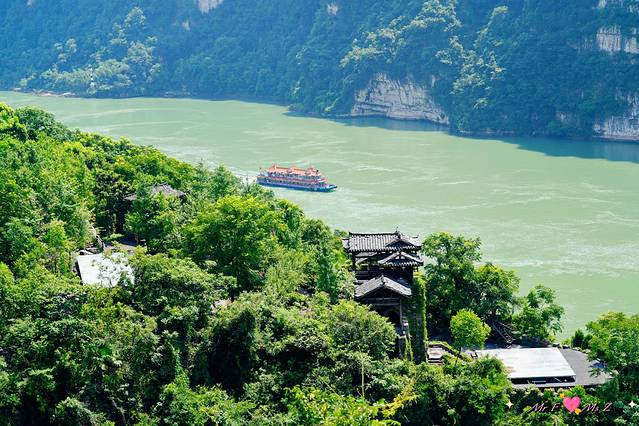 往西俯瞰,下方的白帝城、江峡文化馆、赤甲楼渐次呈现,近处山腰间的绿树丛中还镶嵌着诗意栈道的几个观景台。顺带提一句,赤甲楼是观赏瞿塘夕照的最佳地点,春夏秋季天气晴朗的傍晚不妨在此守候一个金灿灿的瞿塘峡。