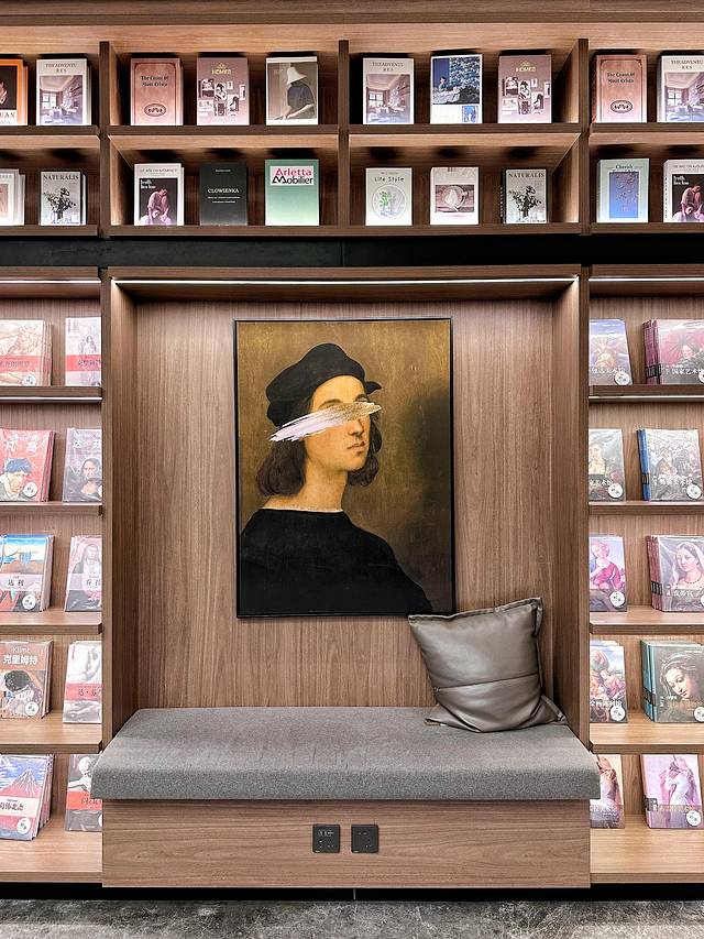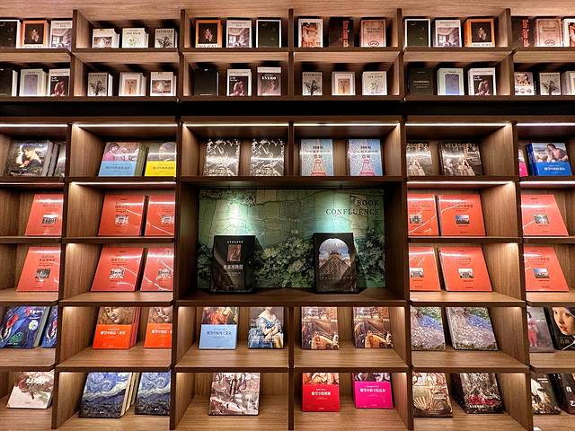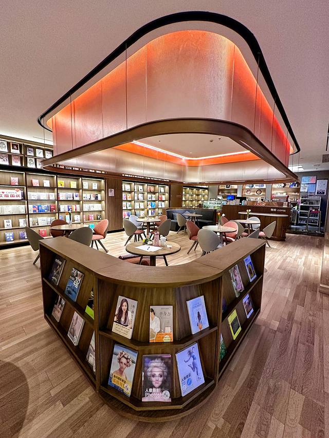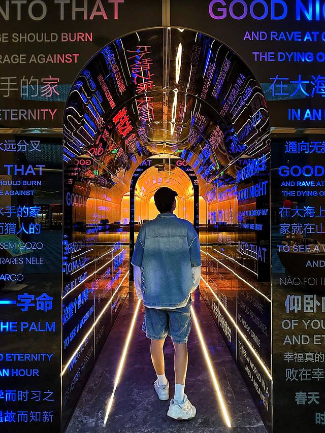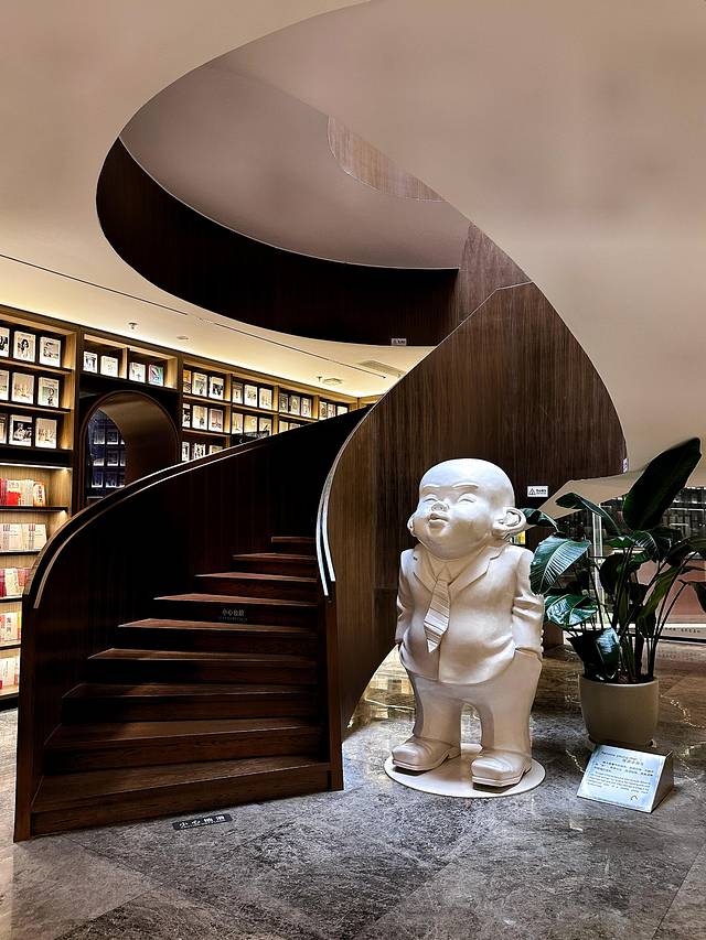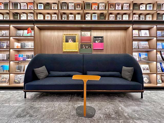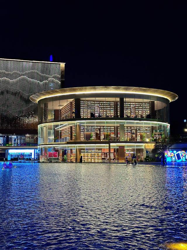 【言+买书汇】是DA艺术街区里一家滨水的书店,从外面看,透明的房子倒映在波光粼粼的水面上,充满了科技感和时空错落感。三层全透明的玻璃外观,自己就像一个会发光的小小星球。书店的内部空间也完全颠覆了我们对于书店传统的印象。负一楼一进门就是一个各种文字组成的光影拱门,两边通天的书架陈列了各种书籍、手工制品和艺术作品。超出片的旋转楼梯和现代摩登的摆件连接着书店的上下层。书店的每一层都有免费的沙发座位和书桌座位,还有咖啡角和儿童游乐区。除了打卡出片,这里也真的适合来看看书,坐上一整天。