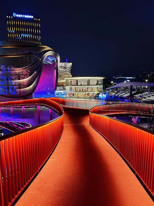 吃完晚饭从【数梦小镇DA艺术街区】出发,一路拍拍照散散步,尤其是在初秋这样舒适的天气里,氛围感很棒!云梦廊桥到夜晚会亮起灯光,顺着廊桥而上,可以感受科技和艺术的完美结合,水池里灯光与建筑的倒影相映成趣。这里经常还会举办各种文化艺术活动、读书会、艺术讲座和手工DIY,想要感受盐城的艺术与活力一定要来这里。