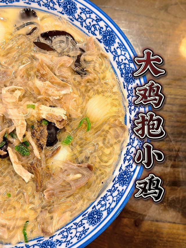 【大鸡抱小鸡】是把鸡肉切成鸡丝,加上鹌鹑蛋围在四周,配合粉丝一起煮,香喷喷的,味道非常鲜美。