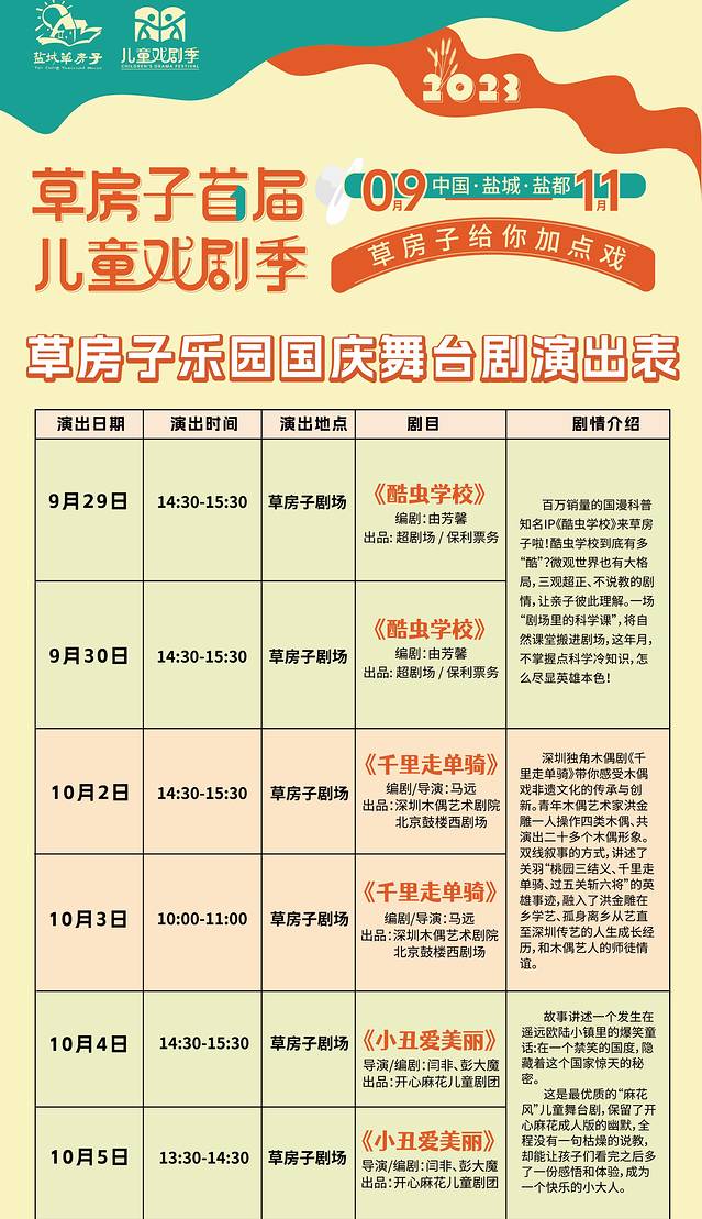 除了《金色的草房子之最英俊的少年》自制剧之外呢,还有三部国家级剧目,超剧场/保利票务出品《酷虫学校》、深圳木偶艺术剧院/北京鼓楼西剧场出品《千里走单骑》、开心麻花儿童剧团出品《小丑爱美丽》等等精彩儿童剧。