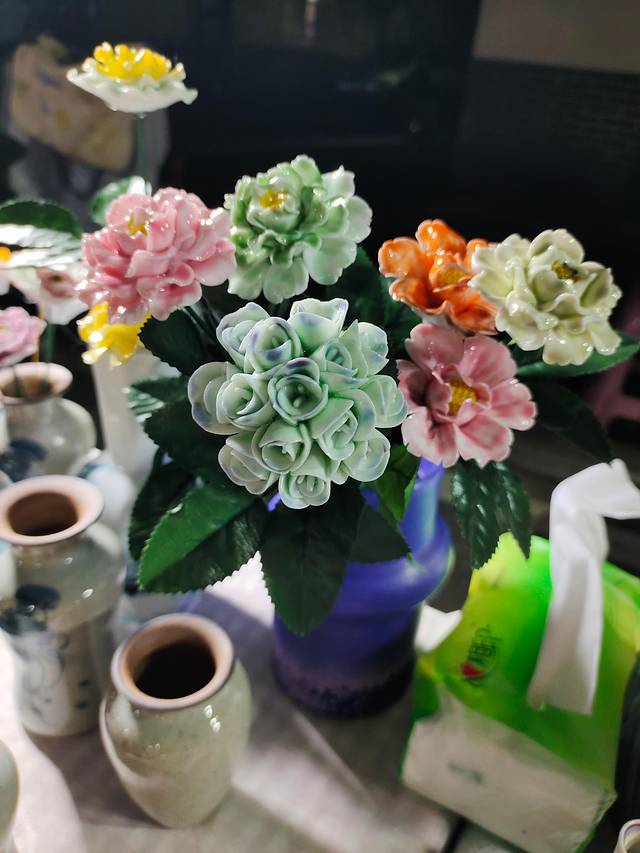买了三朵陶瓷绣球花,一共80块。单买一朵小花也要5块钱,我觉得买绣球花还挺划算的。摊主说现在师傅都不愿意做绣球花了,因为价格不太行~