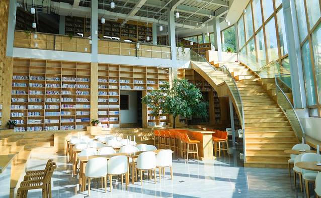 再向前走,走过陡峭的台阶就是年轻人不可抗拒的网红林栖咖啡书吧了。巨大的落地窗简约的建筑坐落着山间,里面藏书达到10W+,可以点一些小吃,披萨意面等等想吃的都有。拍照十分好看,在林栖小镇我竟然找到了藏在山谷里的梦中书墙。