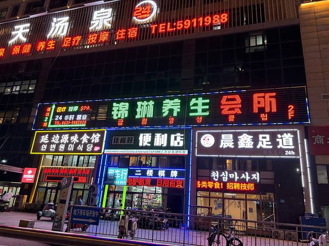里面就是夜市 感觉每个地方的也是都差不多 会有一些韩国料理 也有一些进口超市 主要是韩国商品多一些