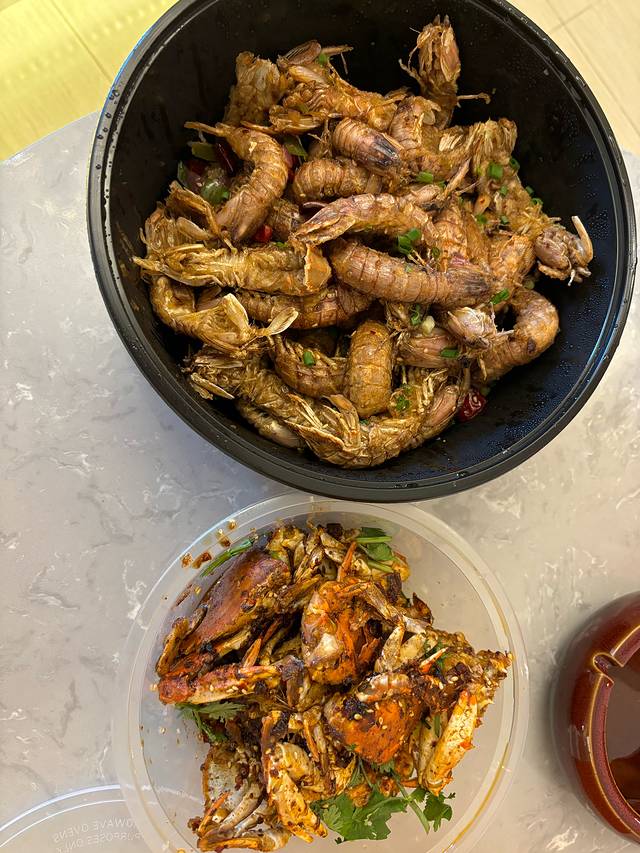 在菜市场买了点海鲜去附近川菜馆加工 真的很好吃 正好买到还有准备蜕壳的螃蟹 贼肥 虽然有点小 做的香辣蟹和椒盐皮皮虾都很好吃