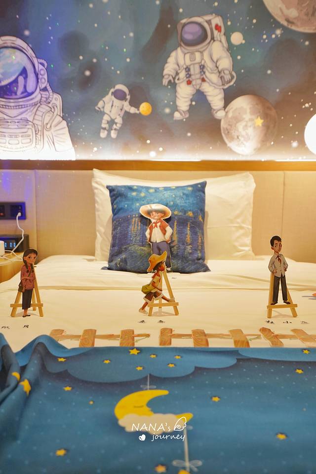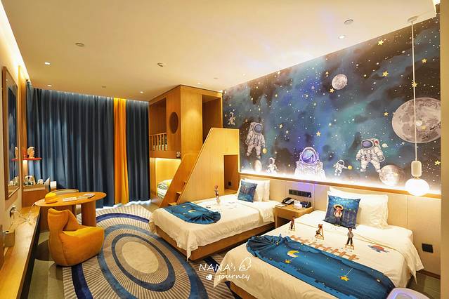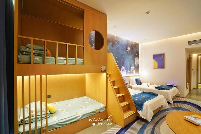 星空房也太浪漫了,最喜欢的设计就是有个叠床,别说宝宝了,连我都很喜欢。晚上还有浪漫的星星点点在整个房间,仿佛到了宇宙,下次一定要带我妹妹和她家娃来感受这间房的乐趣~