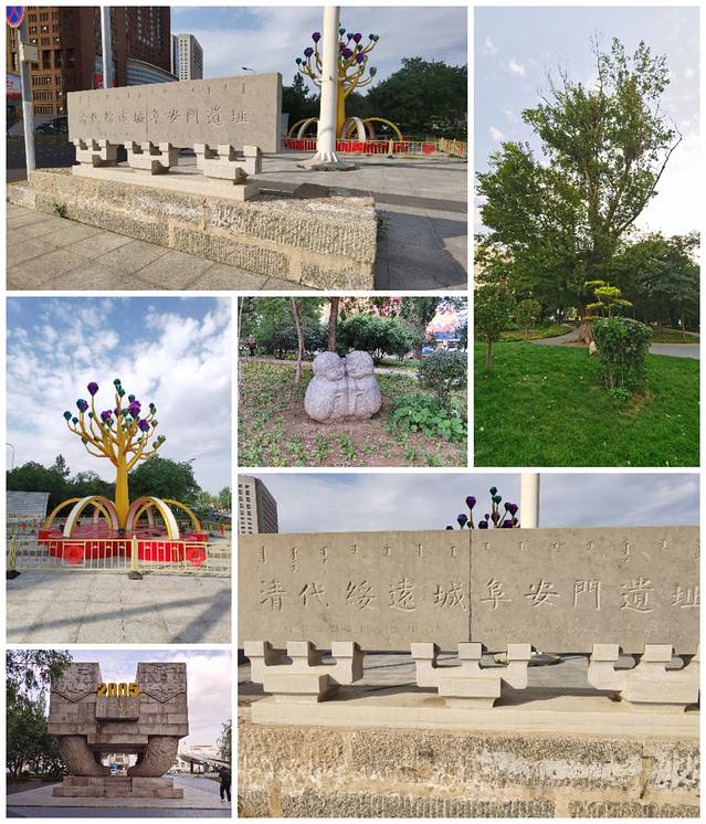 地图上显示它应该是在两条路中间的一片绿地中,从地下通道过来,往西面走可以看到一个写着中国乳都的建筑,虽然设计的很精巧,但这并不是我们的目标。遗址在它相反方向,一直往东面走,可以看到一个像花灯一样的设施,在那个附近就能看到一块很新的长条形的石头,上面写着清代绥远城阜安门遗址。根据石头不同的颜色能看到下面的城砖应该是清代的,底座和上面的石碑应该是仿造的。参观呼市的小伙伴儿时间充裕,可以过来溜达一下,不建议单独前来。