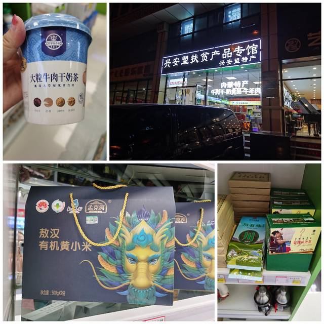 他家应该是对应兴安盟所产的各种农副产品,包括很多杂粮、肉品、奶制品等等。并不局限是呼和浩特市的特产。不过产品相对来说都很正规,价格都是统一零售价,日期很新鲜。因为之前吃过他家的小包装的小米,感觉还不错。所以这次直接买了几小袋奶制品,准备这两天试吃一下,味道不错的话,可以买回去给大家当特产吃。