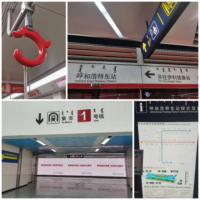 位于呼和浩特市新城区万通路东站南广场南侧,与高铁站之间有指示,中间需要走一段路,有电梯和缓坡,带大件行李也不会太吃力,整个路程大概10分钟,基本在室内,小雨也不太影响。乘坐地铁可以下载青城地铁APP,实名认证后刷码进站。进站后不要着急,根据自己目的地确定好线路方向后,按照指示标志前往。十点多的地铁比较空,还有座,把手是红色的c龙,感觉应该是红山文化的象征,很有特色。