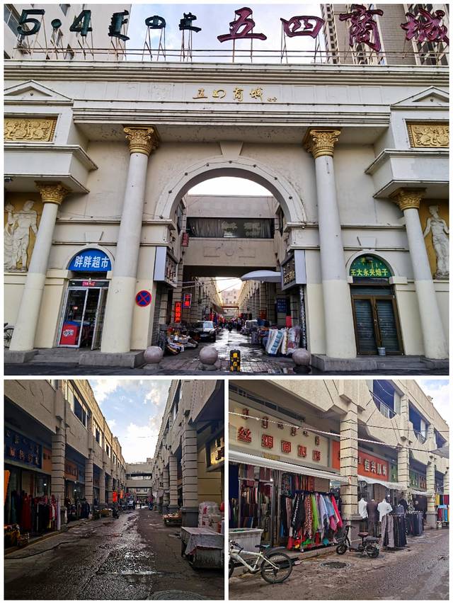 大门上写的是五四商城,导航让我们从这里穿过,本来还担心不大方便,进来以后感觉是一条主街,可以过车,过行人。两侧是一些商铺,可能我们来的时候天也快黑了,感觉没什么人气。主要是卖一些布料,可以直接做蒙古袍,还有一些小的服装店,小餐厅,不太像当地年轻人喜欢逛的地方。