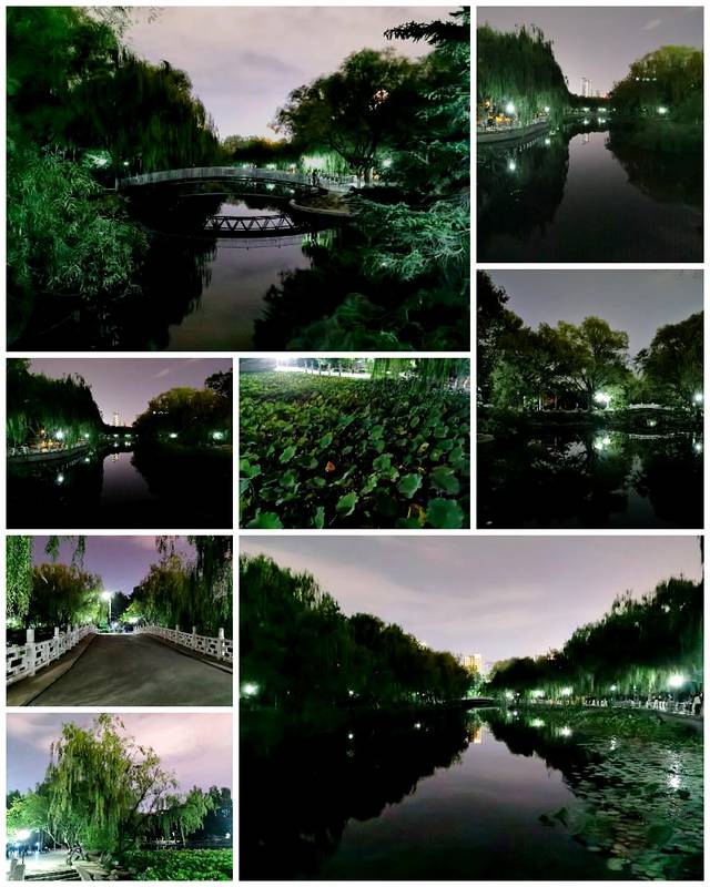 刚刚入秋,天已经黑的比较早了,我们一路行走,慢走过来的时候,天已经黑了。公园门口已经开始跳起广场舞了。公园并不是中间一个湖围绕一圈儿的环形。而是外侧步行到中间有若干湖,最里面还有湖心岛。水域面积不小,我们匆匆的走过,一路有跑步锻炼的人群。中间的湖心岛有若干分支,但是多数都不能直接回到外面,今天还好,晚上第一次来的我们走了很多冤枉路。荷叶大概要走到靠西的位置才能看到,可能夏天已经过去了,我大概只能看到一两朵荷花,主要都是无穷的荷叶,估计早一个月应该会很漂亮。