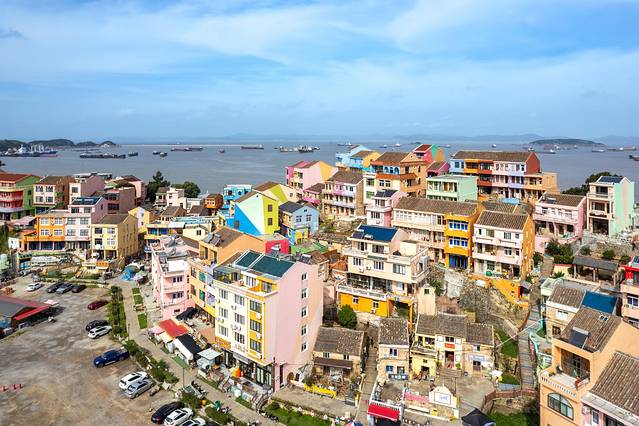 七彩小岛是一个位于石塘镇海边的小村庄。从远处看,这个村庄像一座梦幻的岛屿。