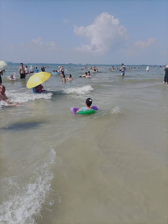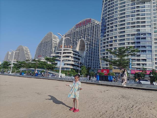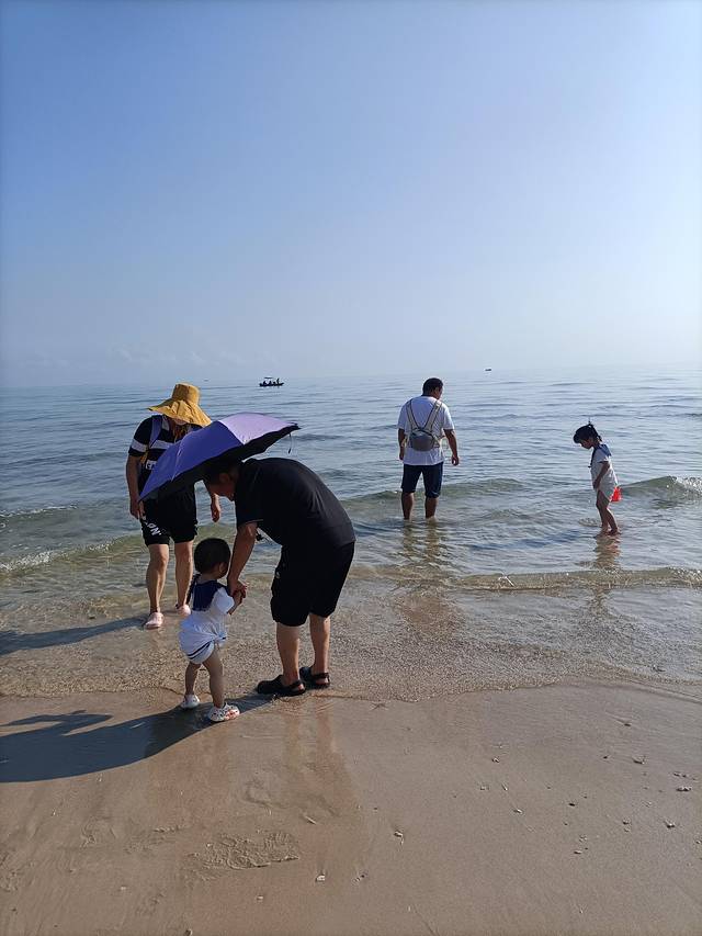 这里的沙子比贝壳沙滩的多,随浪而来都是沙子。带娃随便拍了几张照,也没有去游泳、潜水。已近午时,太热了,老人骑车又意外摔跤,所以后面的行程全部取消,回酒店休息养伤。本来计划16点后去石螺口、滴水丹屏或是五彩滩,但是老人伤重动不了,所以全部取消。