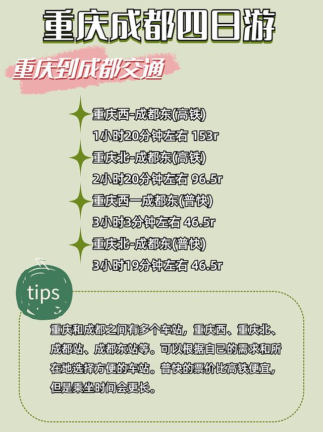 重庆和成都之间有多个车站,重庆西、重庆北、成都站、成都东站等。可以根据自己的需求和所在地选择方便的车站。普快的票价比高铁便宜,但是乘坐时间会更长