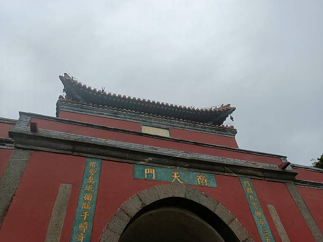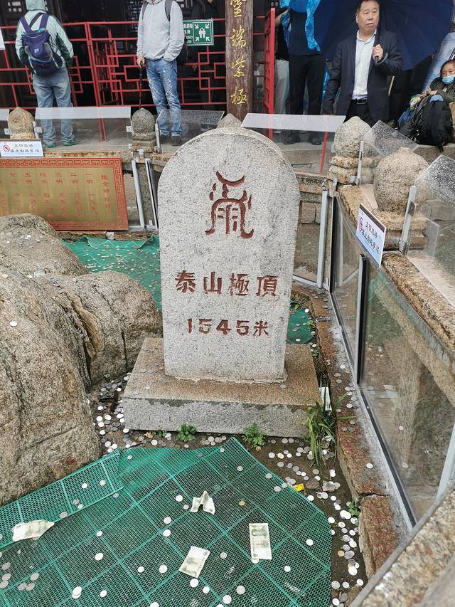已经两股战战,终于咬牙坚持到了南天门,我以为到顶了,其实并没有。你以为的终点,其实只是起点。从这里开始,才是泰山的各处人文景观。泰山娘娘庙、天文台、各种石刻。其实通常按我的个性,我会了解一些人文背景,但是这次爬山有一种肉体已经失去控制,全靠意志力前行的感觉,完全分不出心神去了解了。基本走马观花了一下。而且在山顶上,特别冷,还时不时地下一阵雨,撑着伞,抵御大风大雨,实在没有心情好好赏玩。而且女儿被冻得不行,不停地叫冷,也怪我只想着爬山热,给她穿了冰丝裤和速干T恤,即便给她套上了外套,她仍然觉得冷——冰丝裤随风一荡贴到腿上,体感太清凉了。实在是失策。