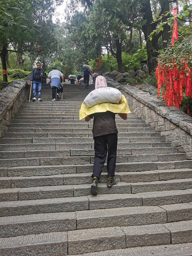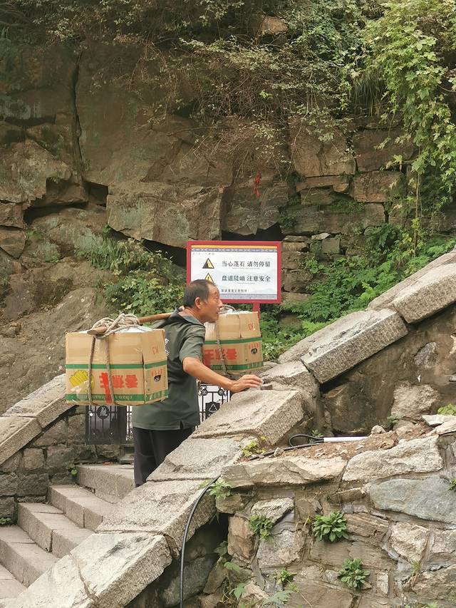 在泰山上也确实看到了语文书中的挑山工,我发现,他们其实也并没有沿着之字走路,大部分还是扶着栏杆在走,可能这样既能省力又能减少脚程,至于保护膝盖这件事,还是我们这些久坐不动的人更需要用之字形走路。特别需要提醒的是,因为泰山比较陡,我们都习惯于埋头走路,很容易会走到挑山工的担子下面,我们沿路看到好几起碰头事件。其实,还是背水泥工的人更苦,一袋水泥100斤,结结实实地砸在肩上,腰完全直不起来,一路走都能看见他们滴在台阶上的汗水。实在很辛苦。