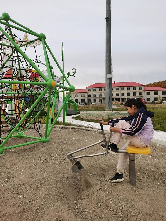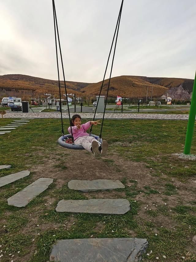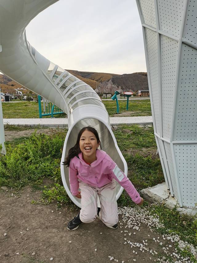 俩孩子到了营地乐疯了,各种玩,秋千、滑梯加大蹦床。