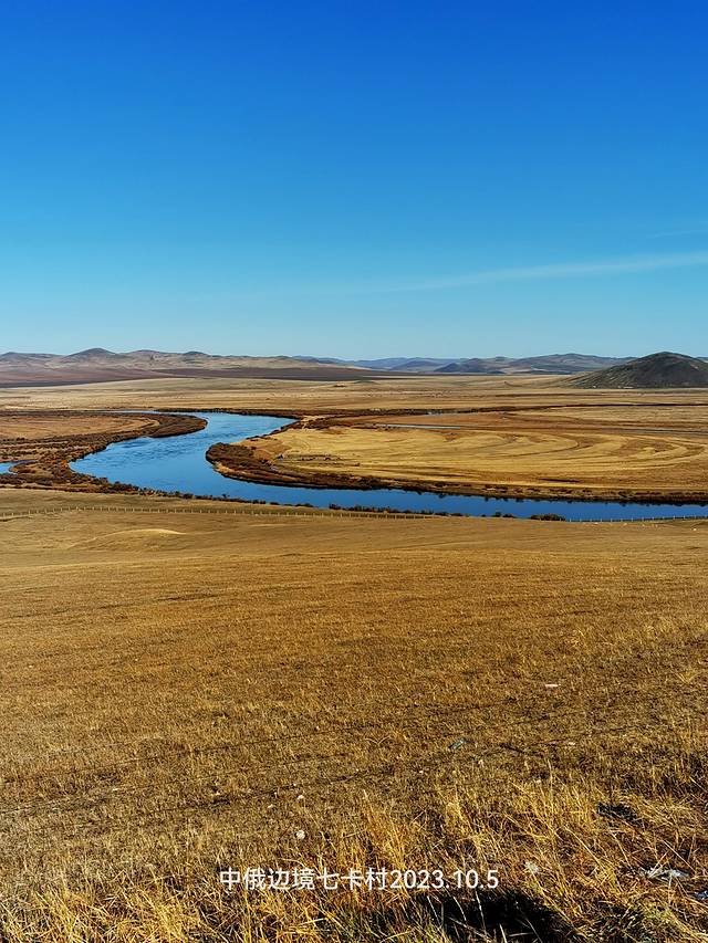 第六天从口岸分开后,直奔186彩带河。186彩带河像挥舞的彩带,弯弯曲曲地延伸在草原上。河的对岸是一个俄罗斯小村庄。可以上观景台看美景,顾问们说很美,但手机拍不出来。
