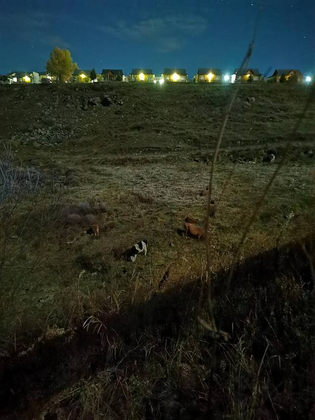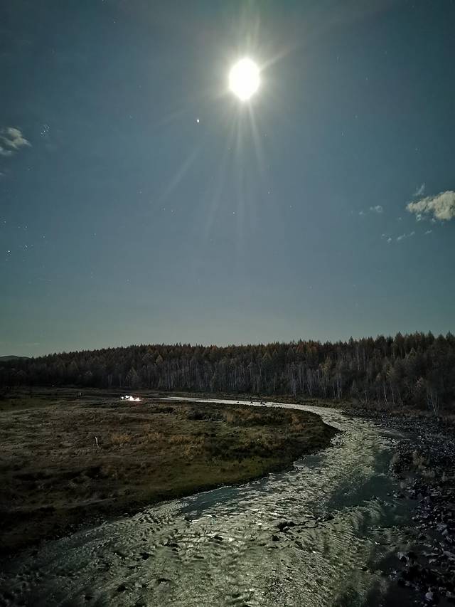散步时,潺潺的流水声,皎洁明亮的月光,偶遇一对鞍山小夫妻,结伴而行。听他们提白天遇到一千只羊过马路而不得不停车,羊过完后全是粪蛋儿的趣事。更好玩的是,散步时我们发现岸边好像有东西,妹妹拿手电一照,居然是牛,还把其中俩给晃醒了…