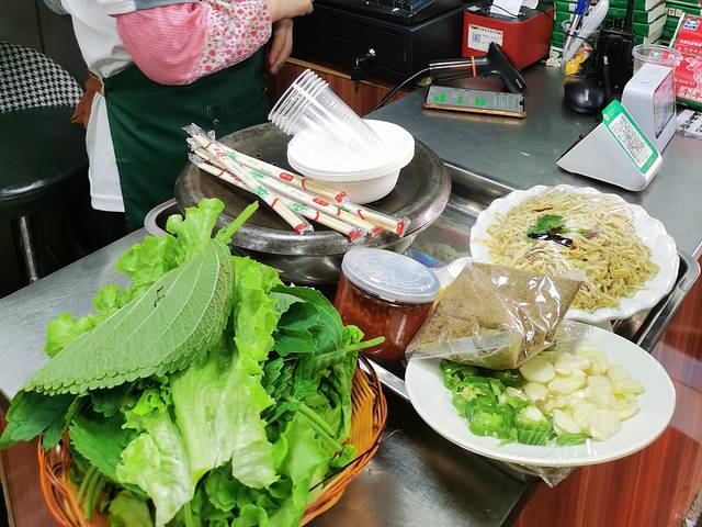 再选点苏子叶生菜、拌菜、酸菜(这个解腻)、大蒜辣椒拼盘、干湿料和餐具,结帐