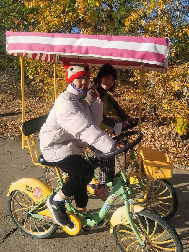 也不远,大约骑八九分钟就到了。阿尔山市也到处可见这种自行车,双人车收费1.2元/分钟,四人车2.2元/分钟(是的,就是这么贵),先预存200元,还车后十分钟内自动退回余额。需要注意的是,车要一定要停在黄线区域内,再手动锁车,还车。要骑再租,别嫌麻烦。有的车没停在黄线区域内,就一直收费,遇到有一家被扣了一百多的。