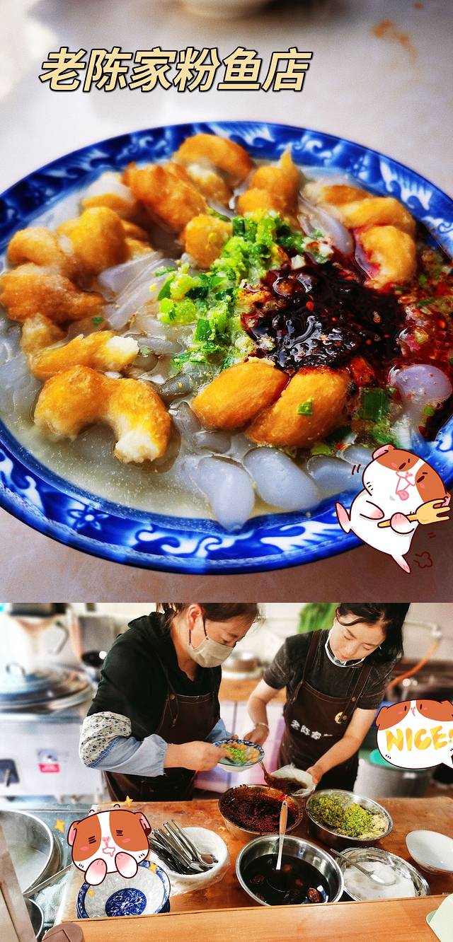 一早,又来到了昨晚的夜市一条街,早上这儿跟昨晚很不一样,像个早市。寻觅当地人推荐的^老陈家粉鱼店^,人很多,试着点了热粉加麻花,外地人表示不太吃得惯,有股中草药味,仅是个人感受不具代表性。