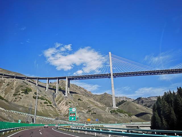 🌉从赛里木湖南门驶出景区,不远处开始有果子沟大桥观景台,我们选择了第四个,正好夕阳西下,好美。果子沟大桥全长700多米,耗资23.9亿,被戏称中国最土豪大桥,每米造价超340万,沟壑之间,北通赛里木湖,南达伊犁河谷,修建难度很大,它的存在使天渐变通途,打开了西域门户。