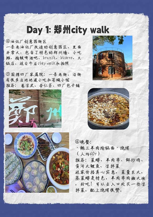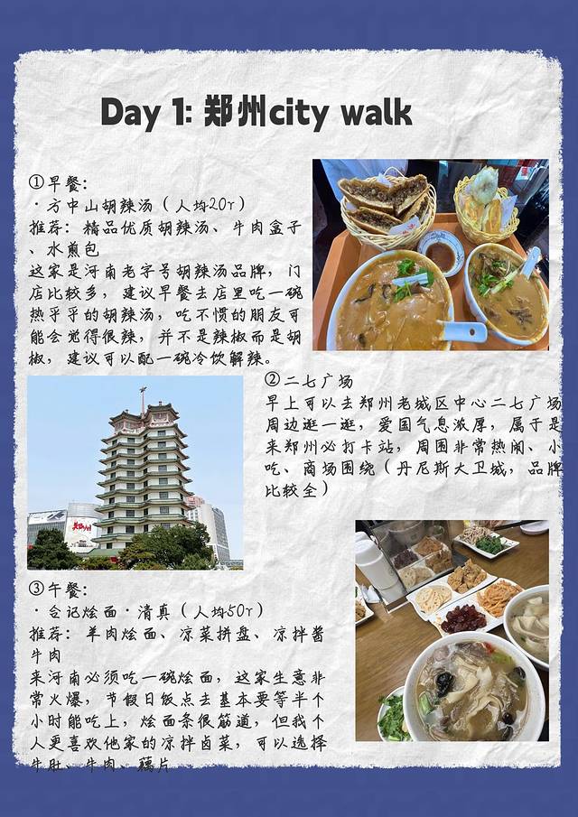 🏞️旅游:郑州的旅游属性不及洛阳,市内打卡点不多,因此一天行程可以完成,作为去洛阳的中转站,放在day1比较合适。