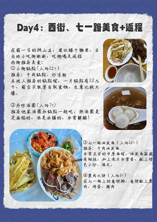 在前一日的爬山后,建议睡个懒觉,去当地小吃街逛逛,吃饱喝足返程