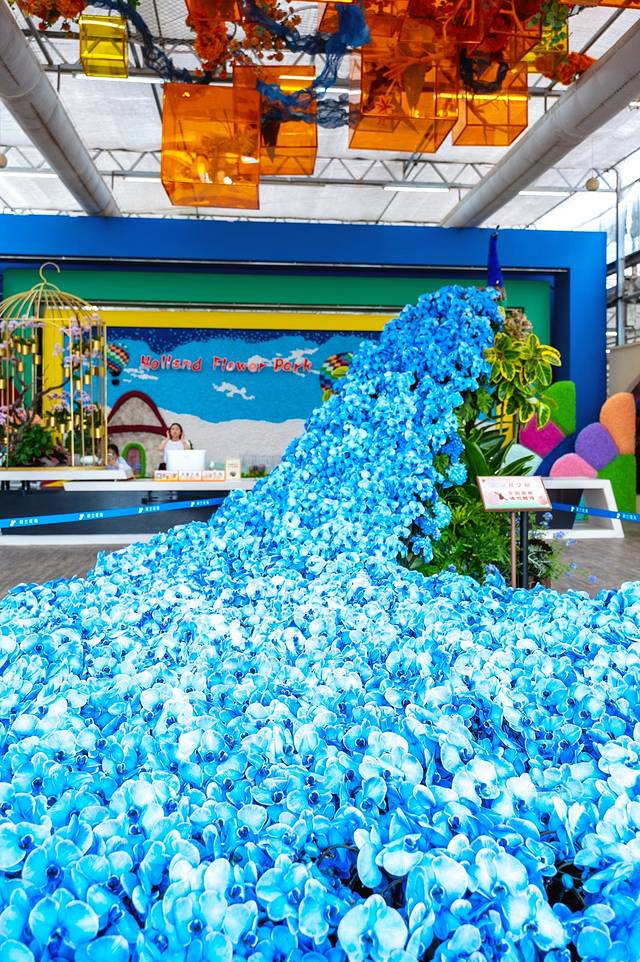 在荷兰花市内,一进门就可以看到孔雀造型的蝴蝶兰,蓝色的蝴蝶兰真的超美超梦幻,仿佛一条瀑布,造型别致生动,吸引了众多游客拍照留念。