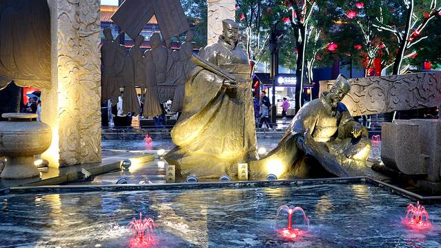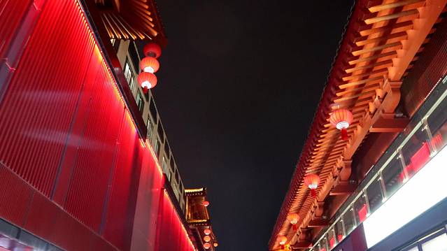 大唐不夜城就是一个步行街,然后路中间是唐朝名人的雕像,两边是唐朝风格的建筑。步行街上说实话可以买的东西不多。不过千万要晚上去才有效果。如果从大雁塔开始走,要走相当长的时间。如果早点到的话,可以打的定位到附近的商场或者不夜城,这样少走很多路。毕竟,晚上不夜城只允许单向步行。要走到头才能掉头回来。中间只有为数不多几个缺口可以过去走反向的路。