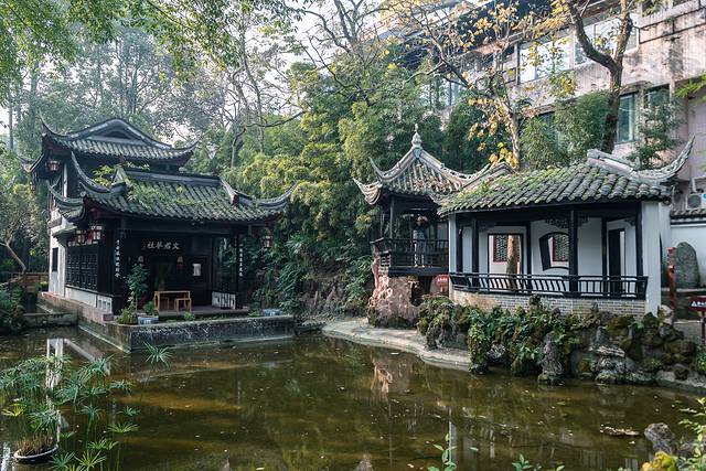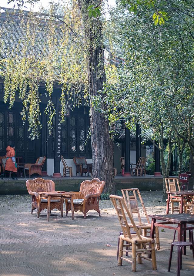 如果说古城带着一些对游客的照顾,多了些“网红打卡”的气质,那 邛崃 人自己的“老公园”,则是文君井园林,在高墙院落的保护下,园林内亭台楼阁、曲径蜿蜒,曾经卓文君和司马相如当垆卖酒的地方,成了人们休憩娱乐的院坝,院坝上的三要素:牌、竹椅和盖碗茶,是刻在 四川 人DNA里的组成部分,喝茶能解决 四川 人一大半的问题,如果不能,就换个地方喝茶。