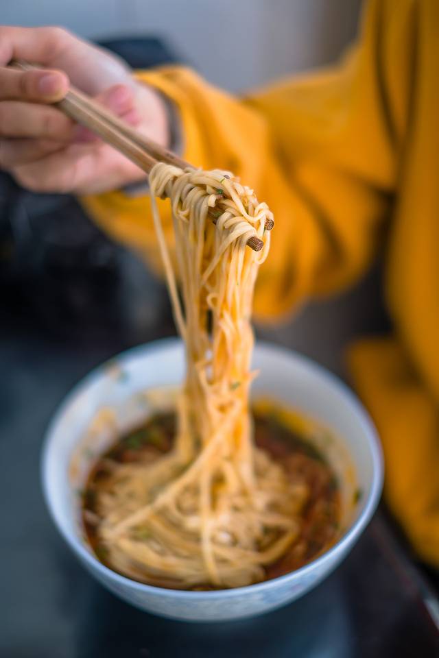 他家的臊子更是让人垂涎,酥脆的笋干和肉粒,冬天再加一把豌豆尖,一点红辣椒油,一口混着脆爽、清甜、嫩气下肚。