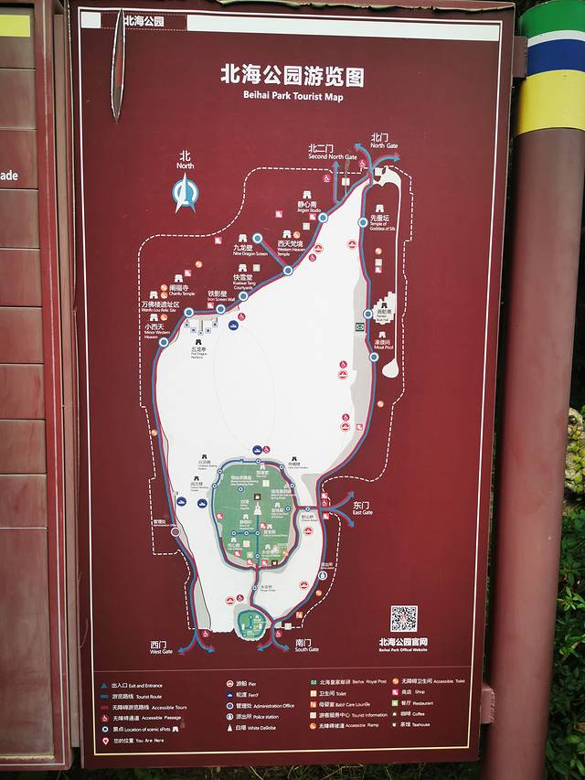 北海公园白塔是一座藏传喇嘛塔,高35.9米,上圆下方,富有变化,为须弥山座式,塔顶设有宝盖、宝顶,并装饰有日、月及火焰花纹,塔身正面有一盾形小龛,内塑红底黄字的藏文图案,含"吉祥如意"之意。