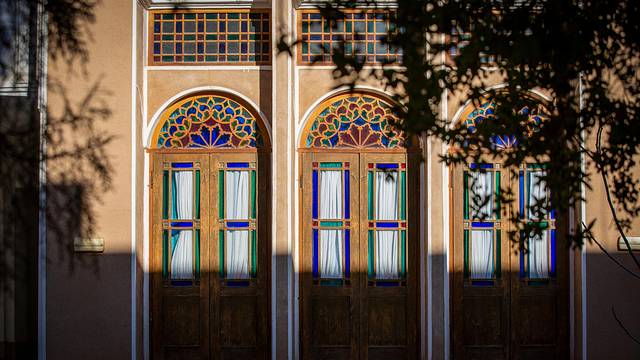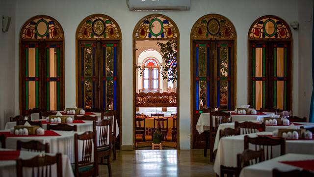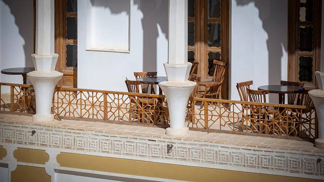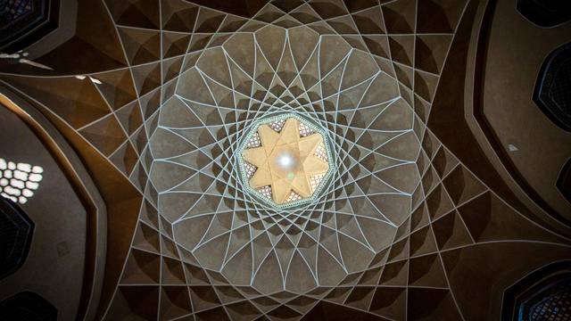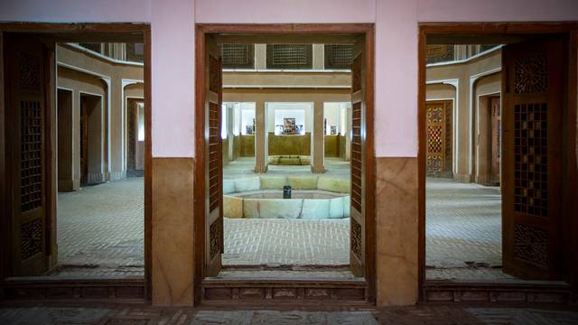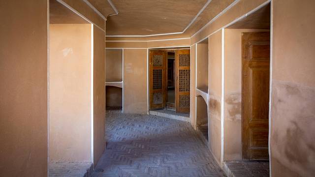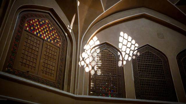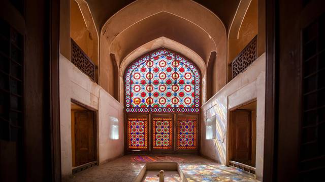在感叹风塔设计精妙的同时,在一条水池尽头的八角豪宅格外引人注目。多扇镶嵌着彩色玻璃的窗户将阳光斑斓地洒在房间内,几乎遍布每个房间的大理石水池成为当时主人乘凉进餐游玩的首选。穹顶上铺着多边形的瓷砖,被设计师用流线打造出一个个精美的图案。