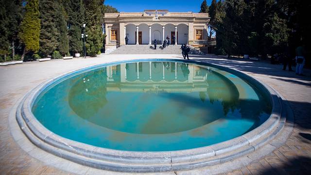 长方形的水池从大门通向宫殿,园子两边种满了伊朗人最爱的野蔷薇。幽深的柱廊为亭阁式宫殿的正门遮挡了烈日,厚重的树荫下带来了凉爽的感觉。