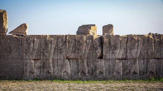 在石柱上用三国的语言书写着“万王之王,万国之王”等相关的话语。穿过万国之门,就是一个用七十二根石柱支撑的,足以容纳万人的觐见大殿。从石柱上残存的浮雕上我们仍能看到巴比伦、印度、埃及、小亚细亚、阿拉伯、希腊等20多个国家觐见的画面。