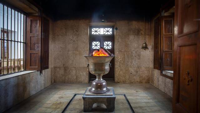 神庙的主体建筑距今已有百年的时间了,拜火教的创始人琐罗亚斯德做为宗教的象征被放在门楣上,房间里就是前面提到的圣火,放在一个青铜制成的火坛中,有专人负责看守,间隔几分钟就需要看守人进来举行简单的仪式,管理火焰的燃烧状况。据说这个火种可以追溯到1500年前,已经成为宗教最重要的圣物,受到拜火教教徒的高度崇敬。