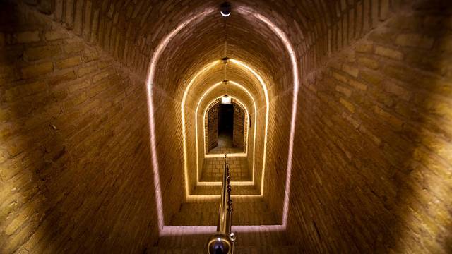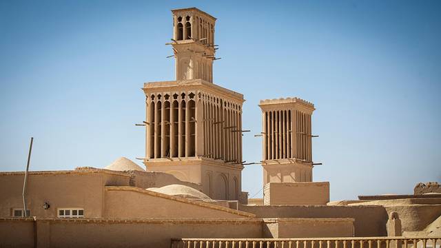 位于伊朗中部的亚兹德,周围基本被沙漠戈壁包围,每到夏日这里就格外炎热。风塔把高空中的风引入,通过塔身降温,再经过风塔正下方水池的二次降温,凉爽的空气就可以飘散在各个房间中。然后通过室内外温差产生的压力,再将房间内的空气抽到室外,这样的空气循环就完成了。在如此不断的空气循环下,最终室内外温差甚至可以达到10度以上。
